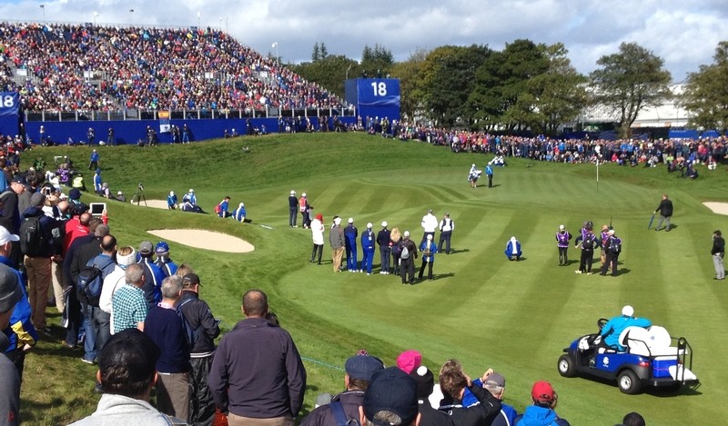 Having had the good fortune to receive an invite from the PGA to attend the Ryder Cup on the Friday, I was able to witness the atmosphere first hand that was generated by the forty or fifty thousand plus spectators who certainly play their part in creating such an occasion. Having taken in the initial excitement of the first tee on the first day, I made my way to a vantage point where I was able to witness the morning four-balls make their way through.